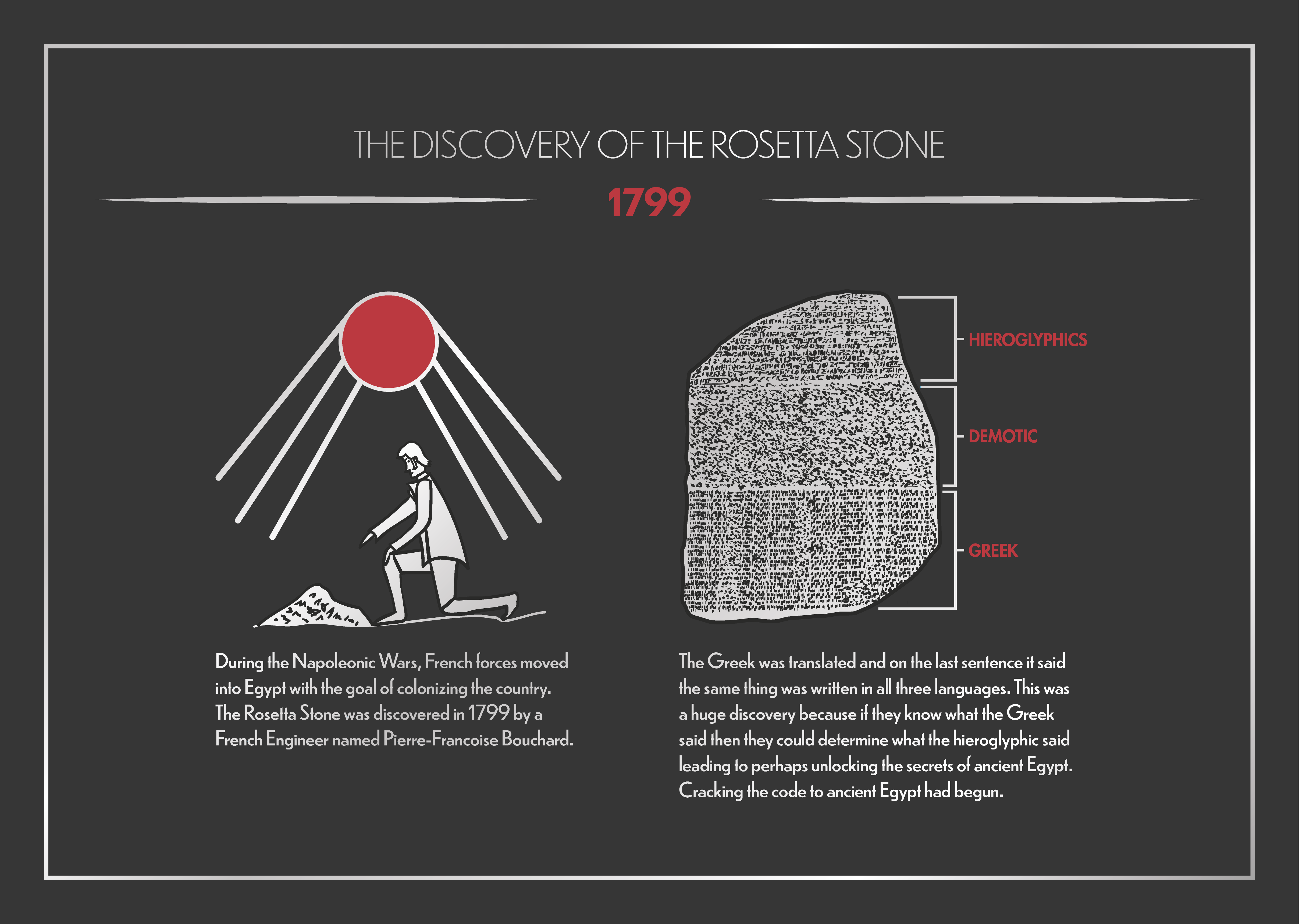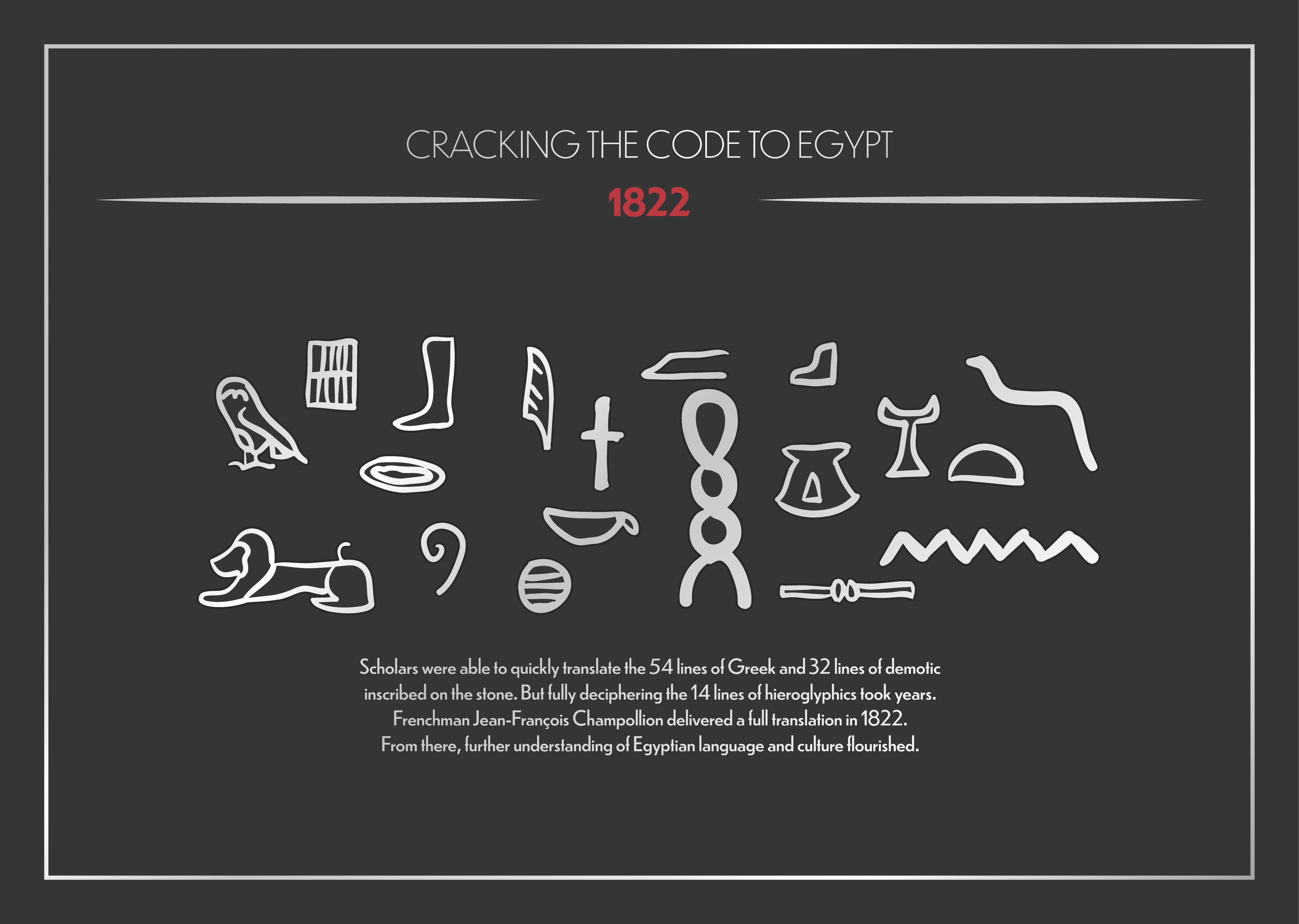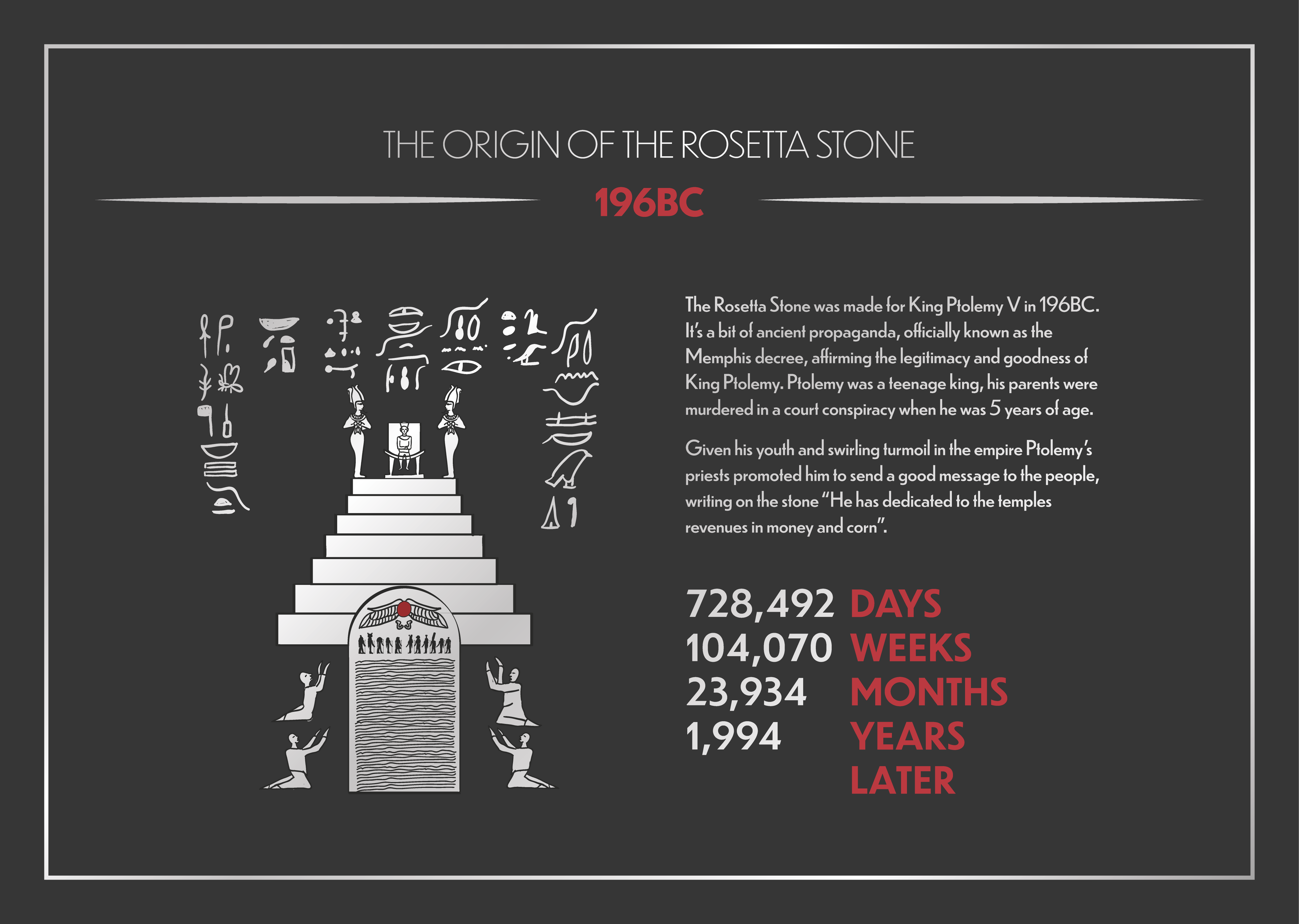 This was an exciting and challenging brief. To demonstrate the vast history of the Rosetta Stone took some time to get right. The finished piece displays the Rosetta in a modern and efficient way displaying key information.